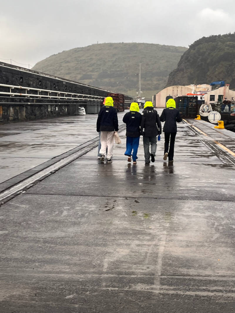 De eerste mensen zagen we zwaaien naar ons schip. Zo veel mensen op de kade niet normaal. Het voelde een beetje alsof ik in een dierentuin zat waar iedereen naar keek. Ylona en Berend stonden ook op de kade (onze deckhands die in Horta van boord waren gegaan). Wat was het leuk om hen weer te zien!