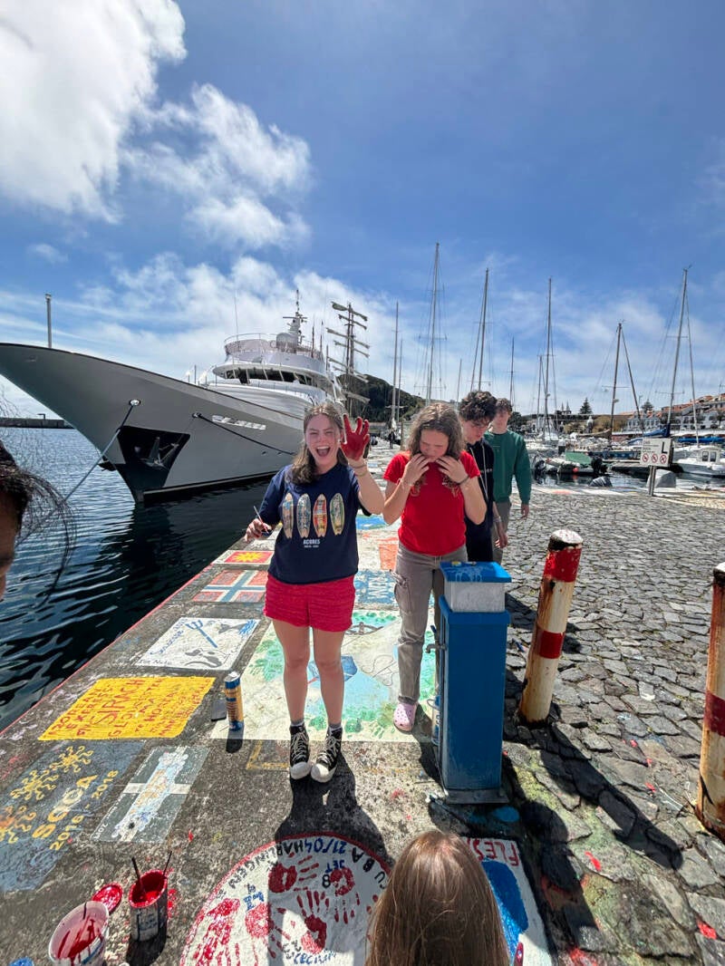 De ochtend begon normaal met zelfstudie. In Horta heb je aan de kade heel veel schilderingen van zeilschepen. Nanke heeft hier een prachtig kunstwerk gemaakt. Maar wij wilden ook wat doen, dus we hebben met een groepje in een half uurtje onze eigen tekening gemaakt. Mooier had zeker gekund maar in het tijdsbestek dat we hadden is hij heel goed gelukt. Tijdens happy hour is het schip zee-ready gemaakt, dus de stoelen en tafels het dak op, het tentdoek weg en de netten omhoog.